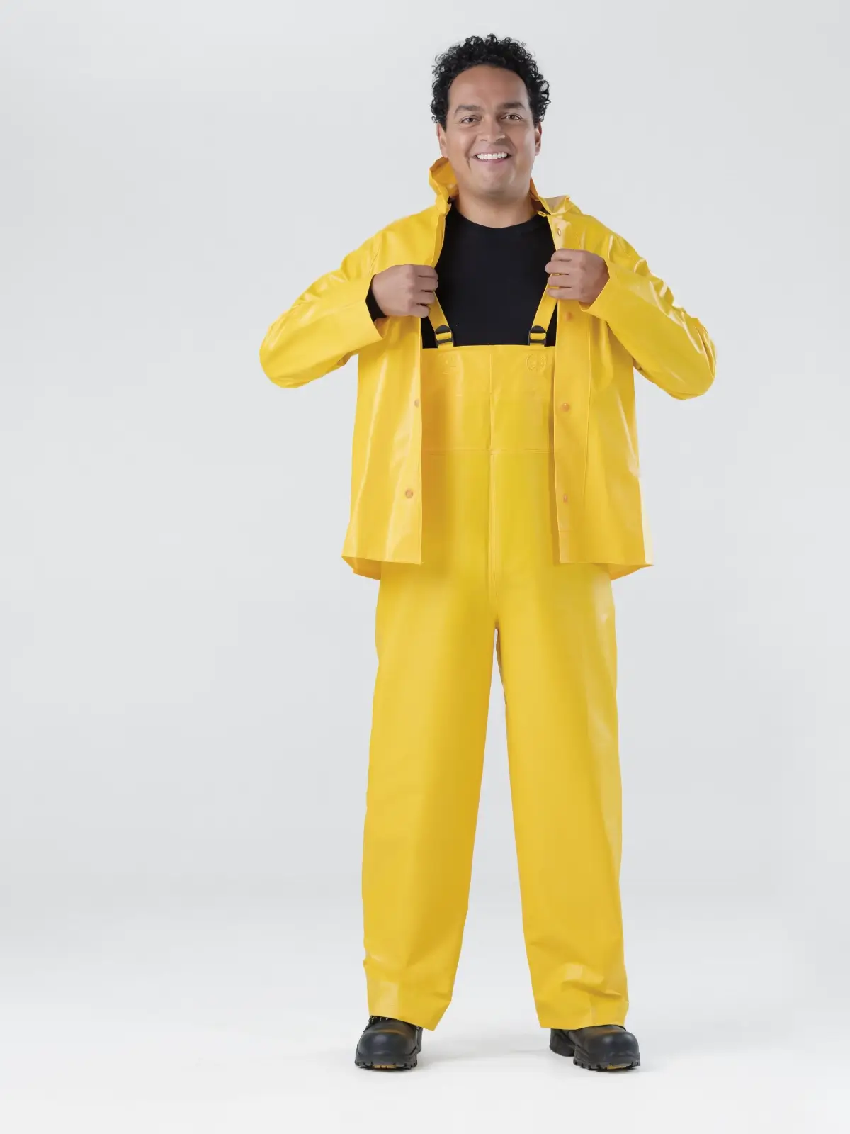 Compuesto de 100% PVC, el juego incluye pantalón con peto, tirantes, chaqueta con bolsas laterales y broches ajustables.