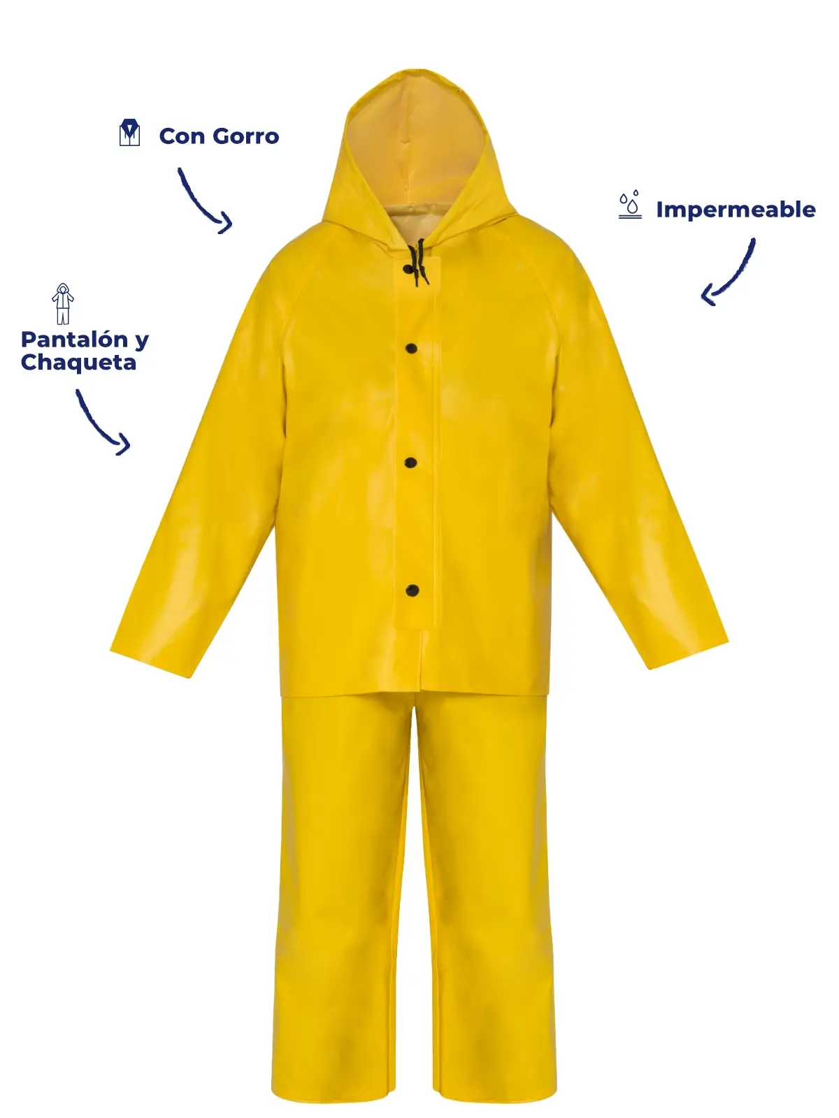Juego Completo Impermeable, una solución completa que te enfrenta a climas adversos con total protección y comodidad. Este juego incluye pantalón con peto, tirantes, chaqueta con bolsas laterales y broches ajustables, todo fabricado en 100% PVC para mantenerte seco en cualquier situación.