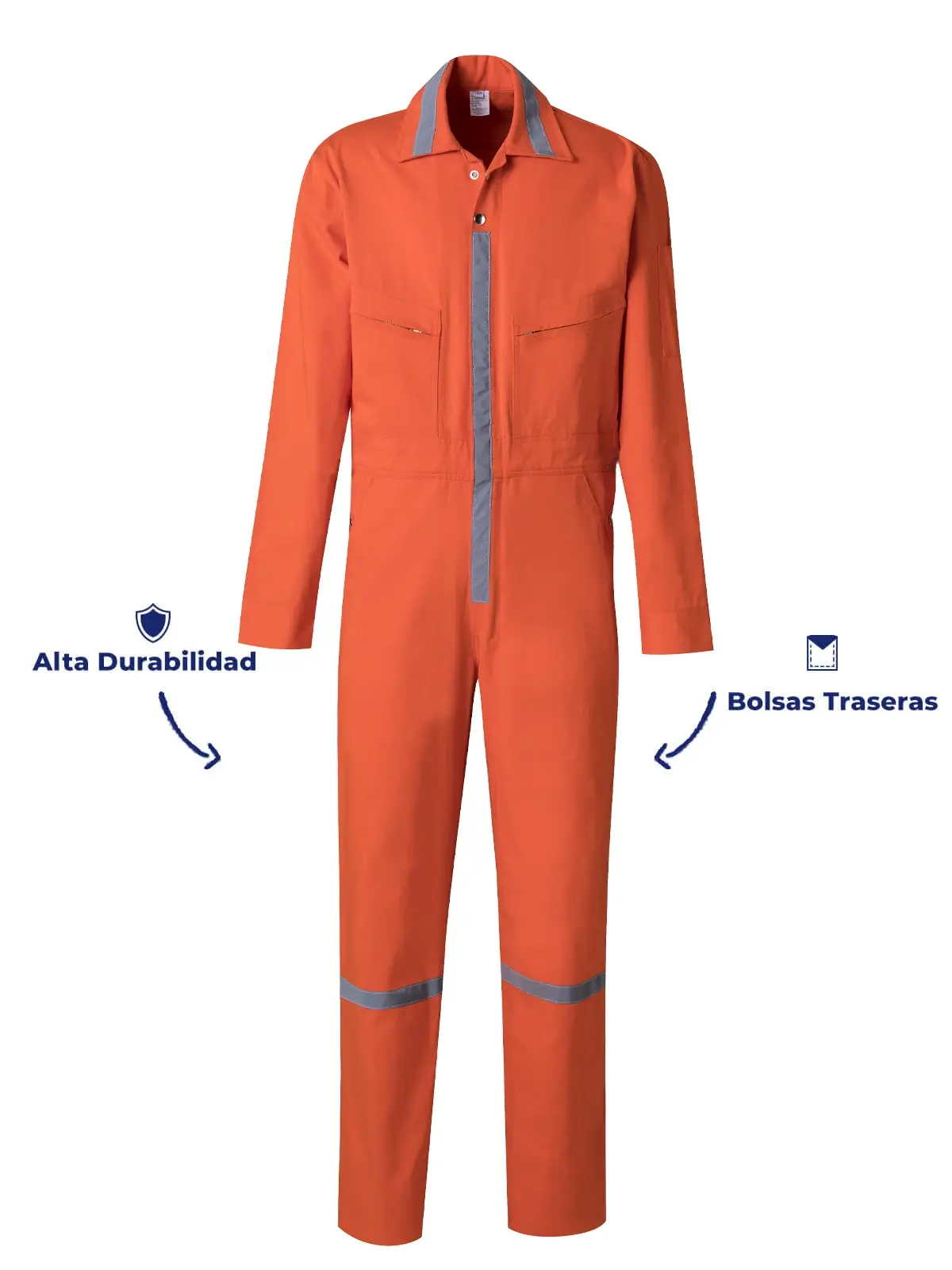 Nuestro overol cuenta con bolsa en la manga izquierda, así como en el pecho, ambas con cierres. El cuello y los detalles de los cierres cuentan con cintas reflejantes. La pretina es elástica para mayor movilidad.