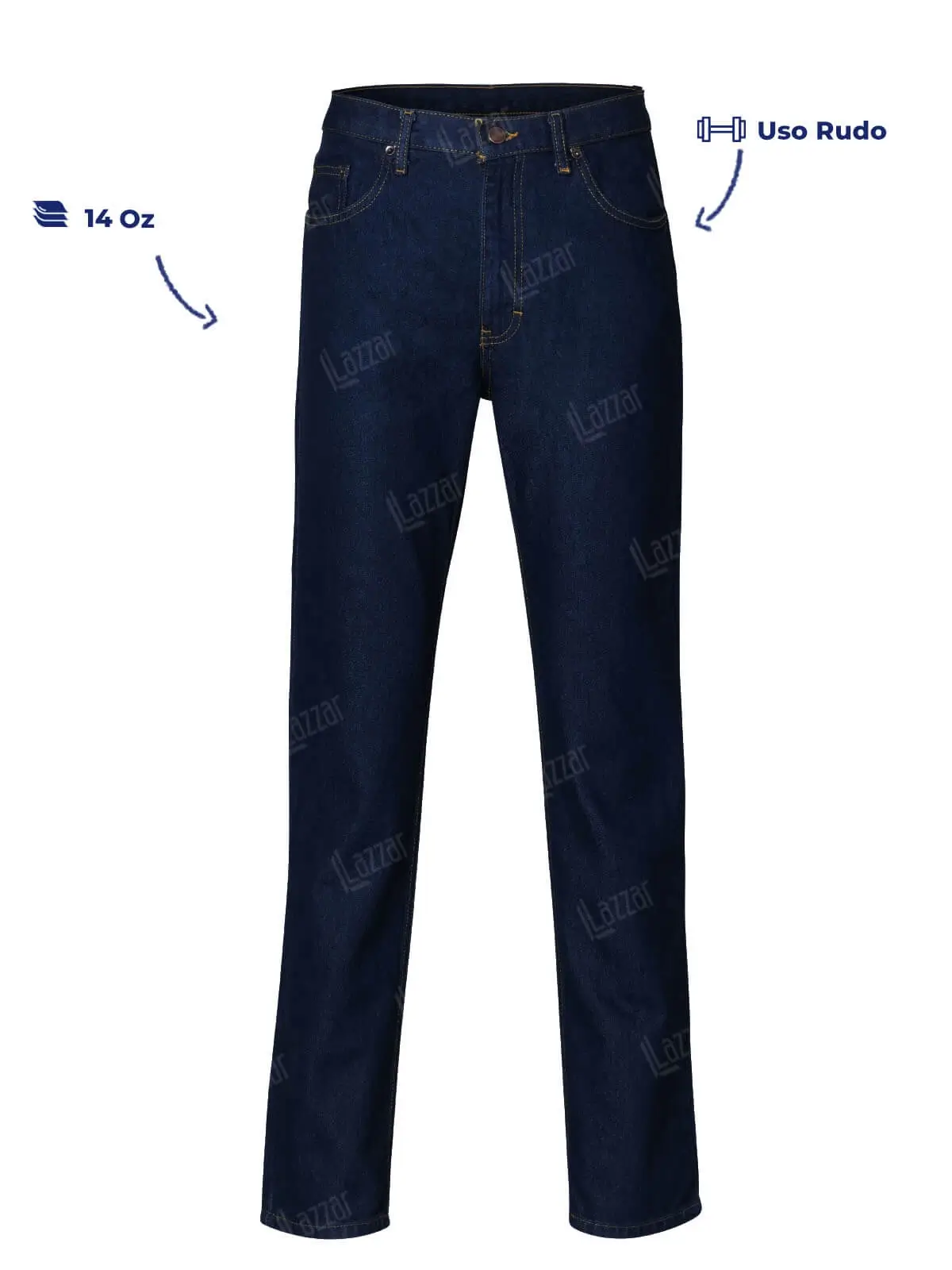 Nuestros pantalones industriales de mezclilla de hombre tienen Double Stone Wash y suavizado y son de 14oz.