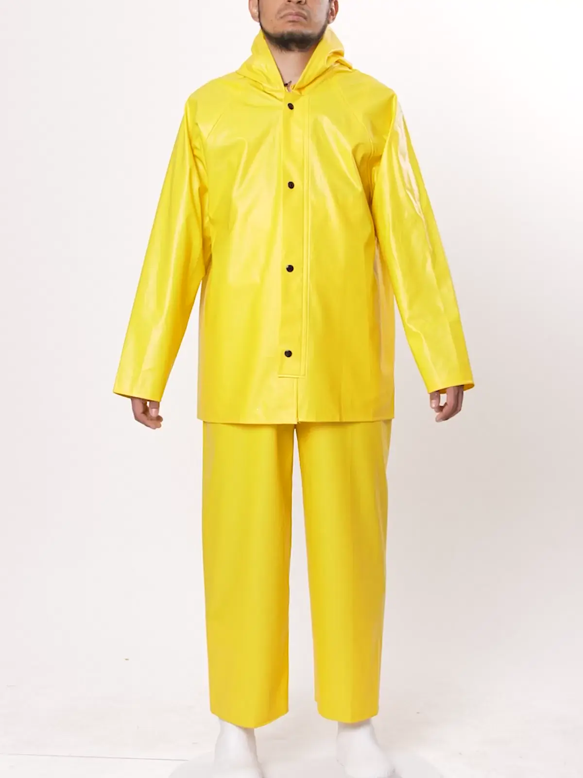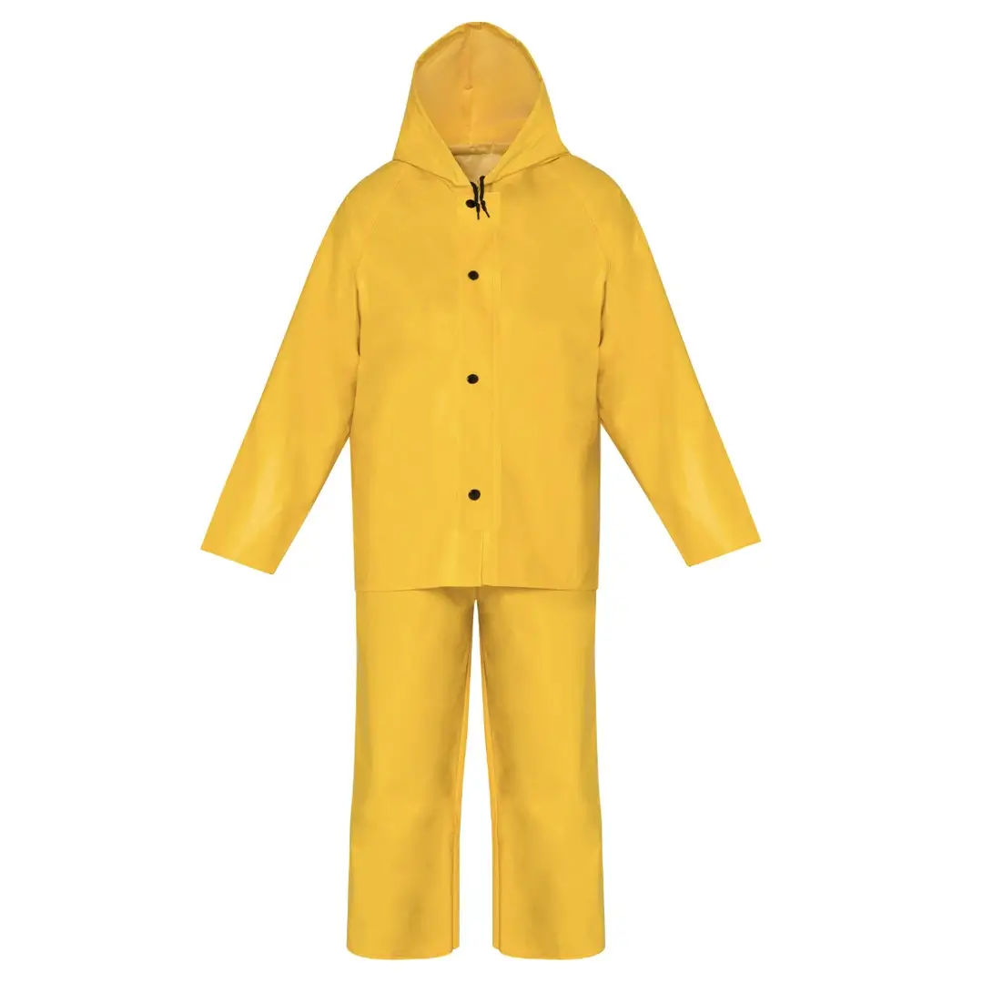 Compuesto de 100% PVC, el juego incluye pantalón con peto, tirantes, chaqueta con bolsas laterales y broches ajustables.