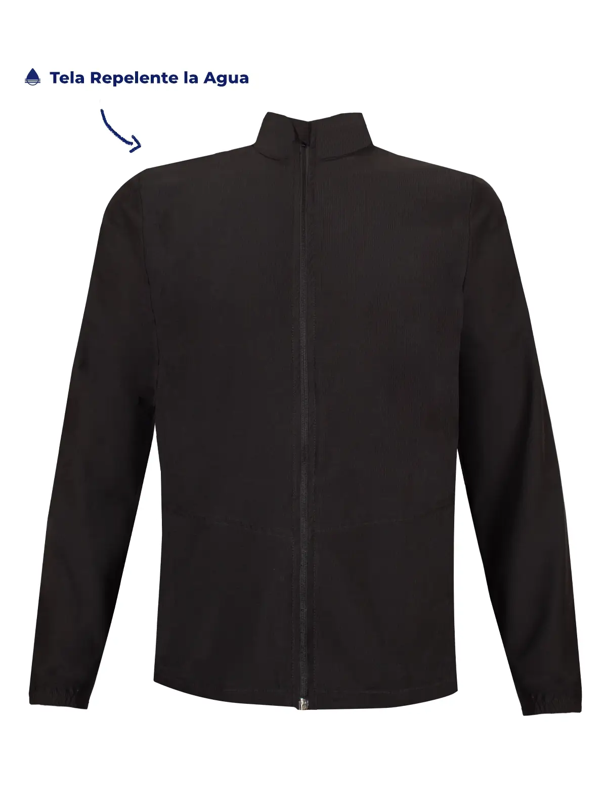 Modelo con ajuste en puños, cierre frontal y bolsas laterales, tela repelente. Disponible : Negro.